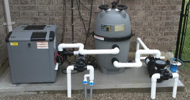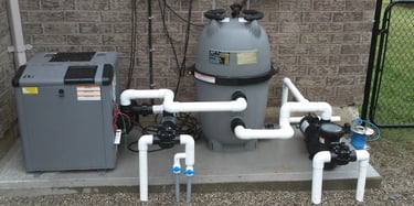 Next, the plumbing and electrical systems are installed. This includes laying pipes for water circulation, installing skimmers, drains, and returns, and setting up the electrical components for lighting and other features. Proper installation ensures efficient operation and safety. The diagram below shows a simplistic plumbing layout for a pool, depending on the number of jets, water features and overall size, complexity of the water handling system can be increased significantly.